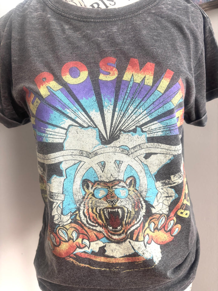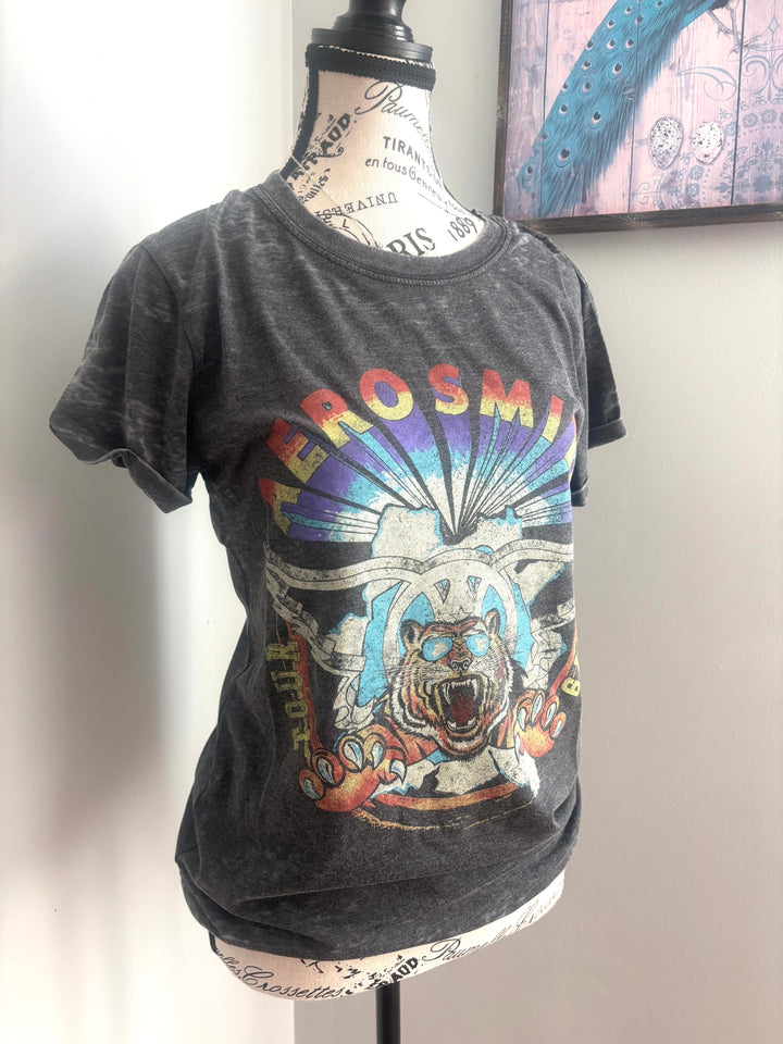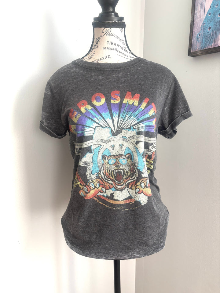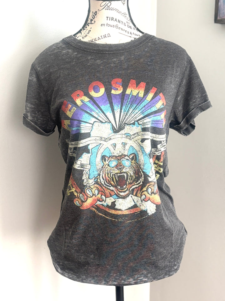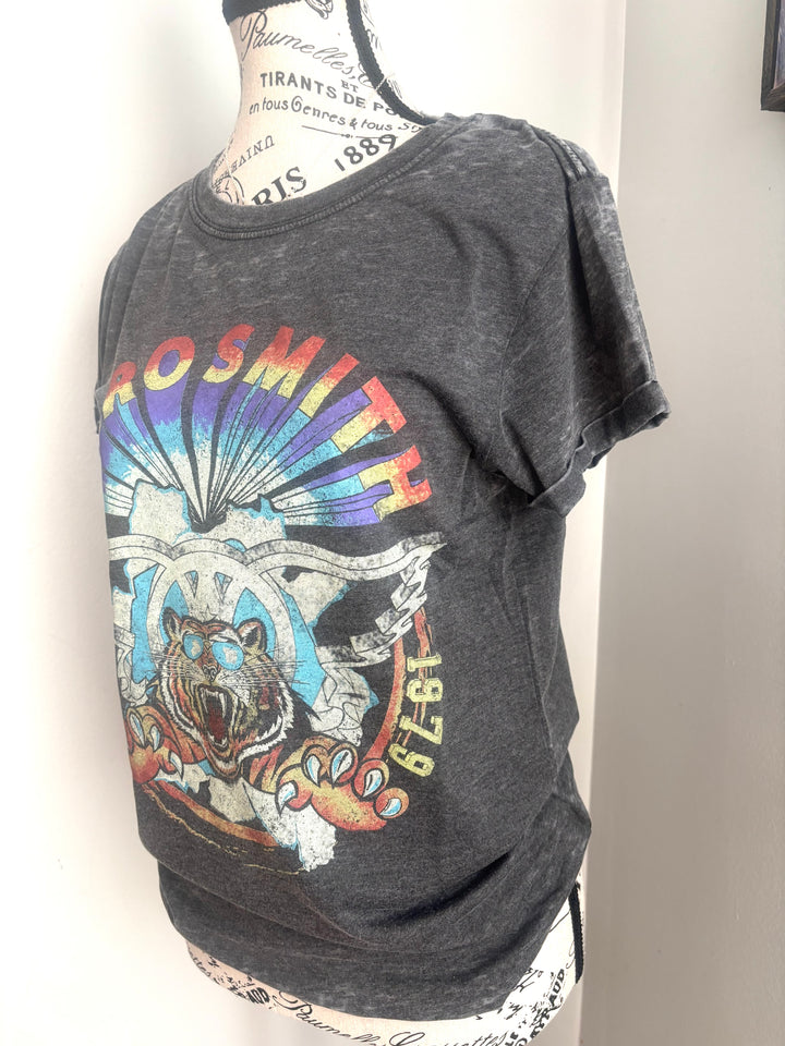 Classic rock band Aerosmith vintage-inspired t-shirt, features a graphic from the 1979 tour. Performed during a recording break for their album, “Night in the Ruts”. The band tee is made from ultra distressed, washed down cotton, and finished with cuffed sleeves, a ribbed crew neck, and a fitted silhouette.