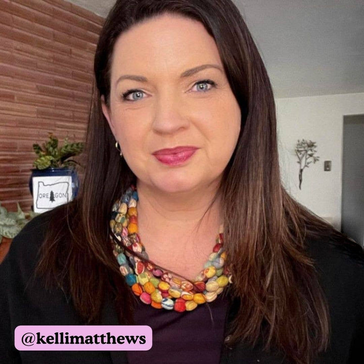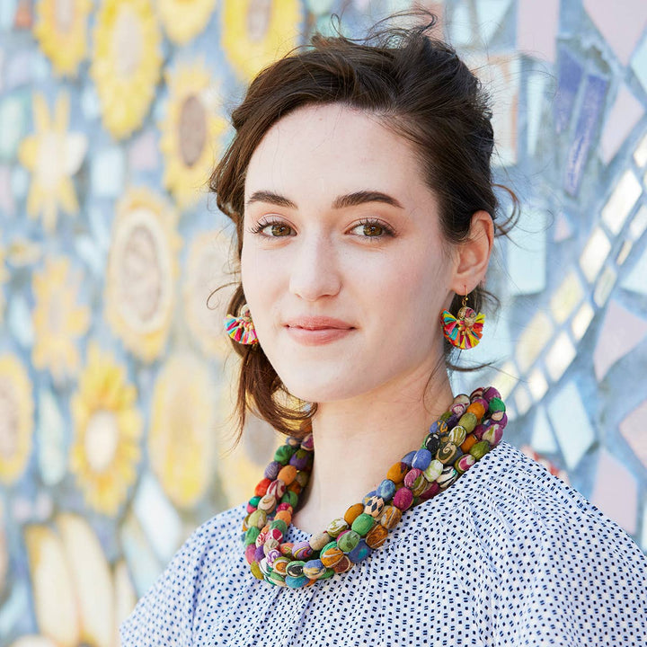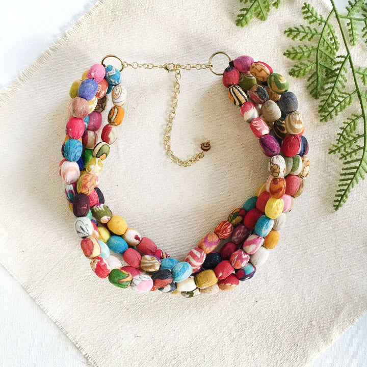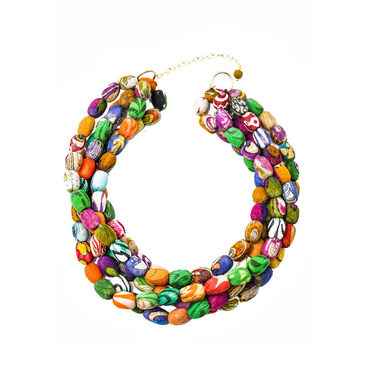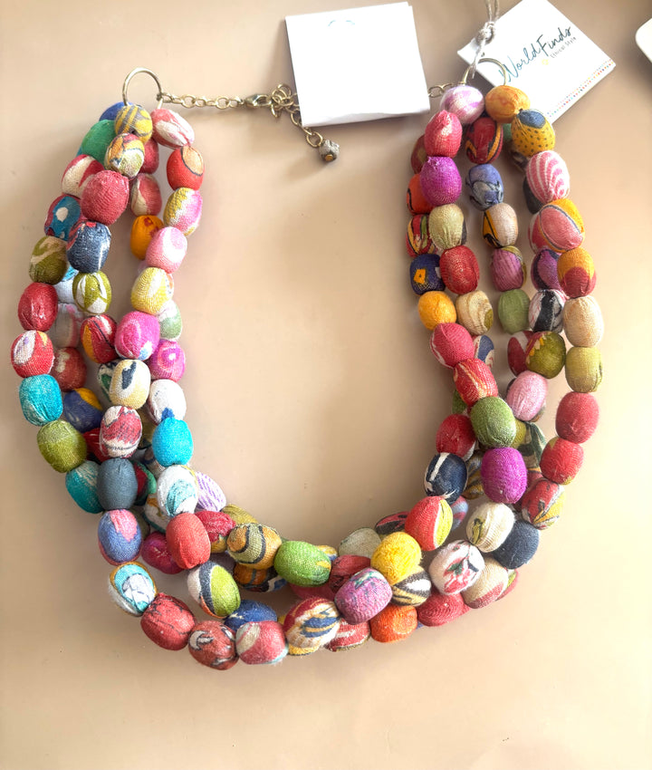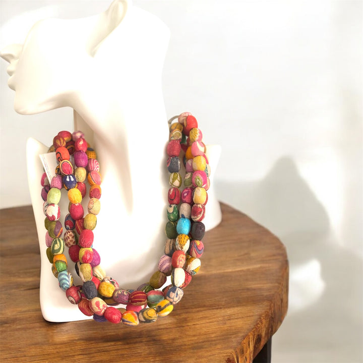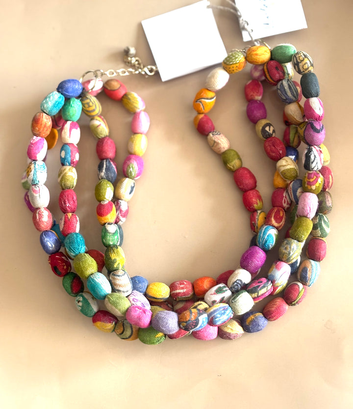 Four strands of oval-shaped Kantha beads layer and twist for a colorful pop at the neckline.