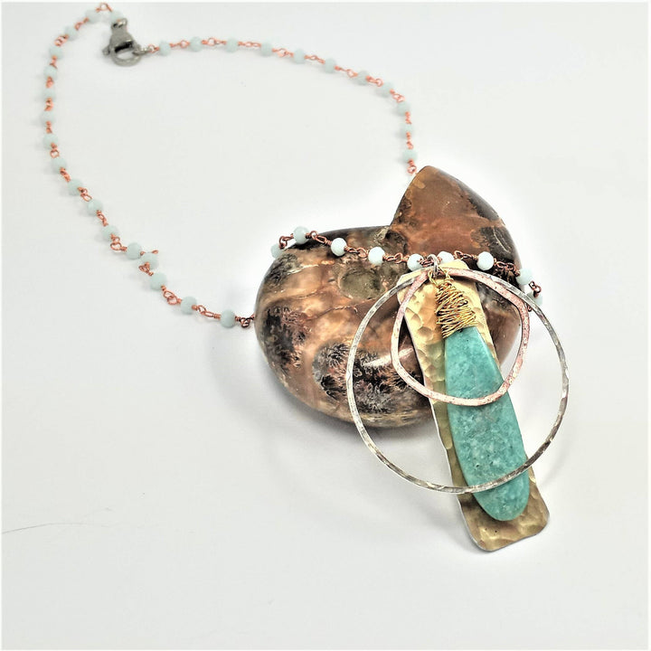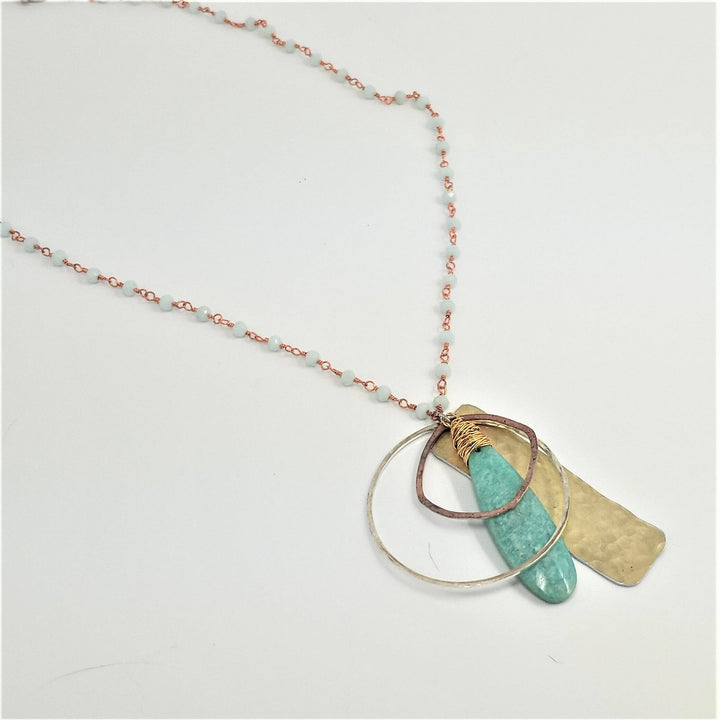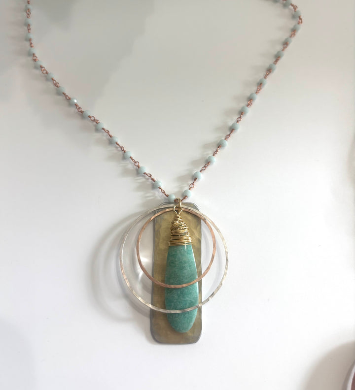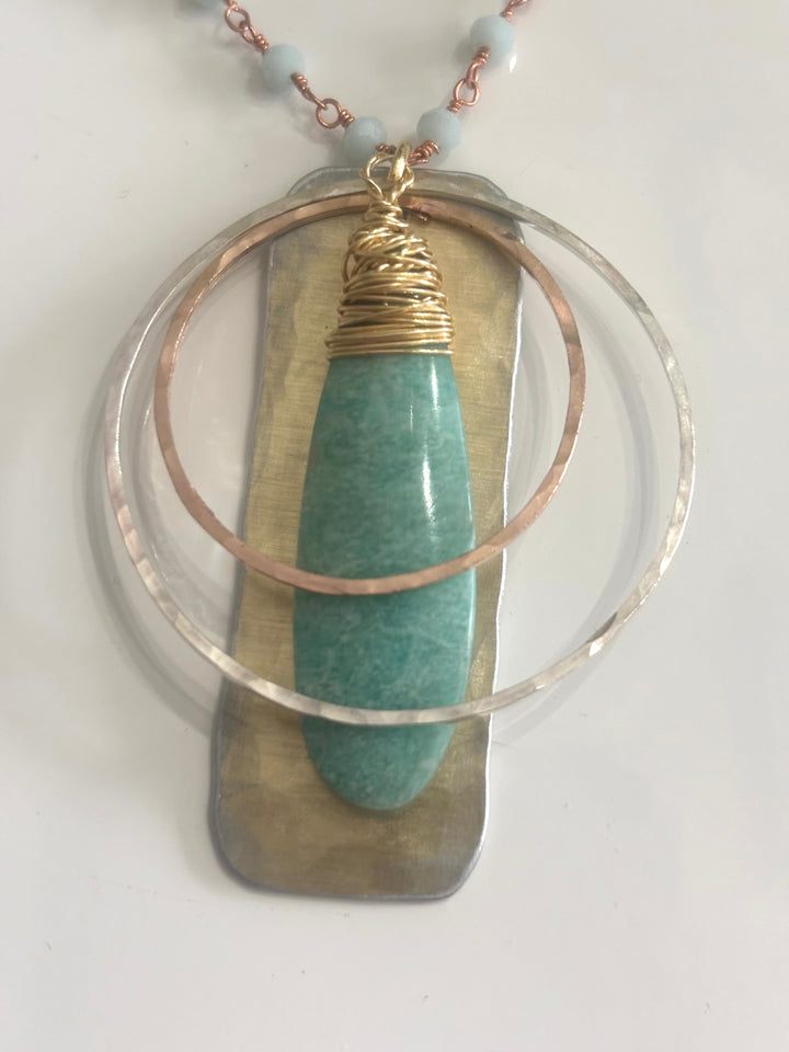 Amazonite lightlty wrapped with gold fill wire on hand cut, shaped, sanded, hammered, textured, waxed golden aluminum and silver, rose gold filled dangles on amazonite rose gold chain. Necklace 18" long Pendant 2" long.