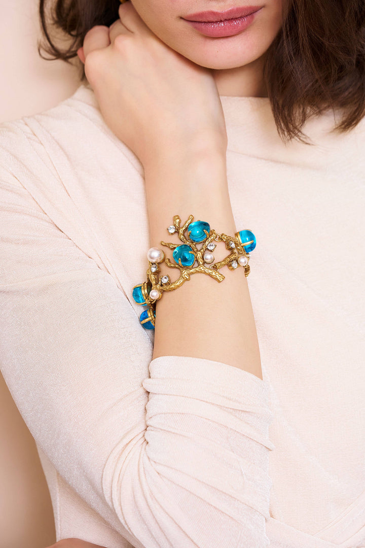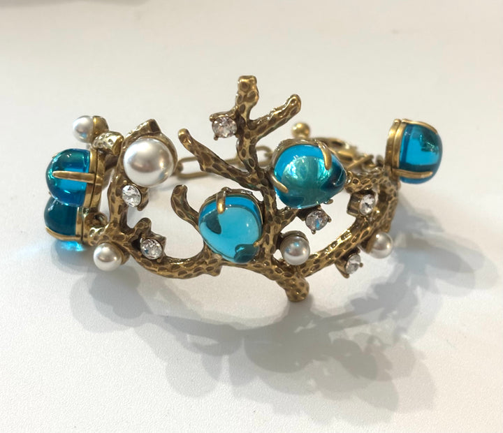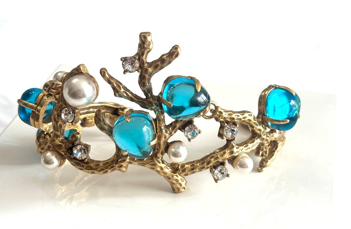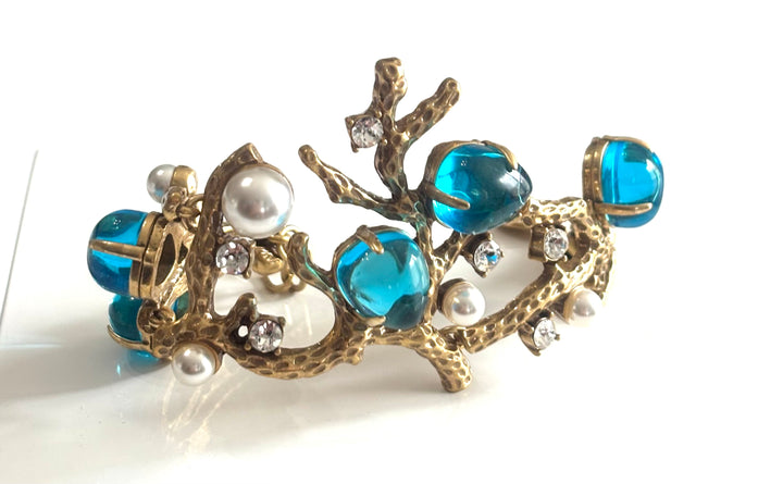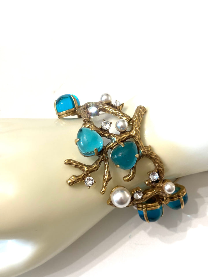 This gold-plated bracelet with a lobster claw clasp features 8 and 12 millimeter faux pearls, crystals, and aqua cabochons, creating a beautiful, ocean-inspired design.