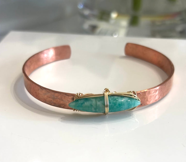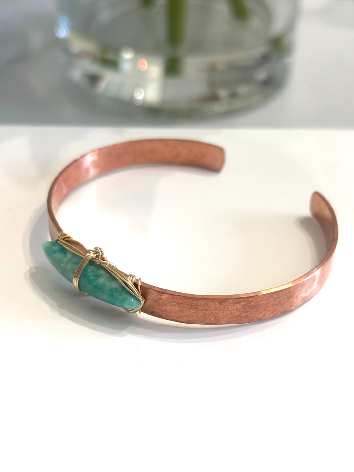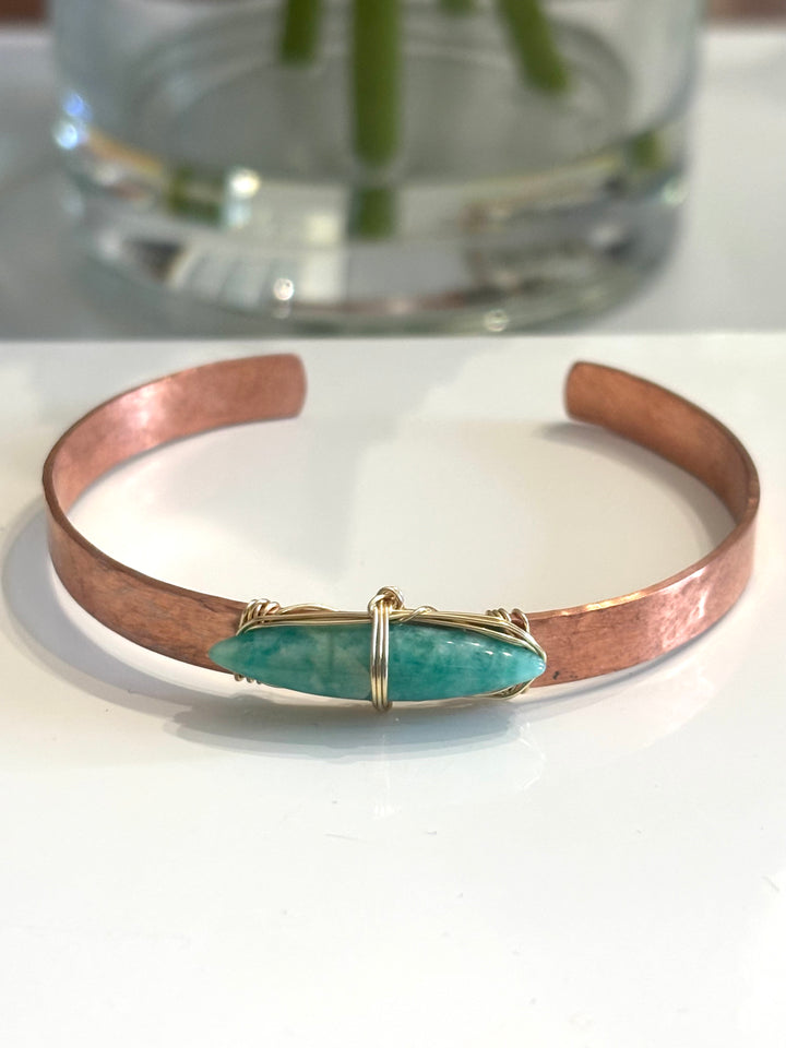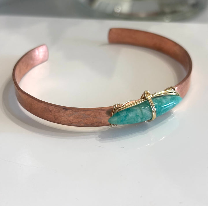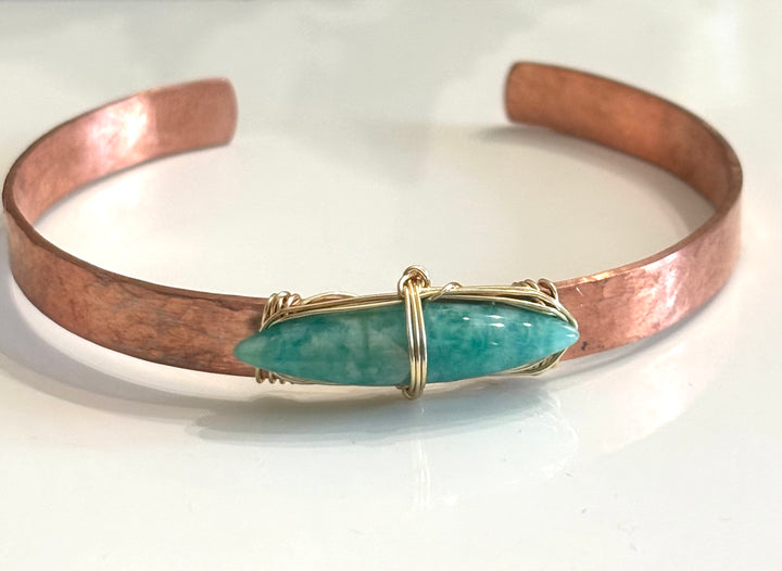 dainty amazonite lightlty wrapped with gold fill wire on hand cut, shaped, sanded, hammered, textured, waxed .25" wide copper cuff bracelet. One of a kind and signed.