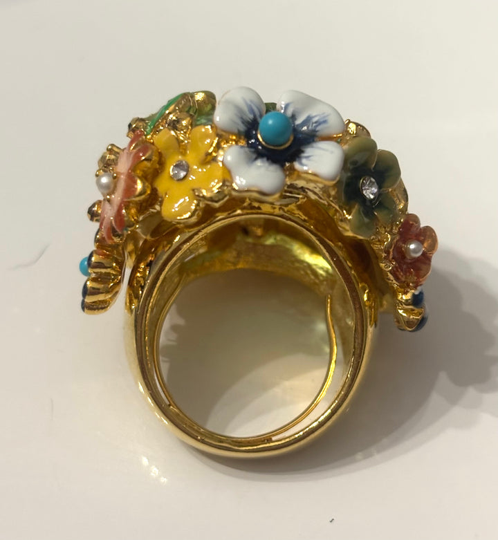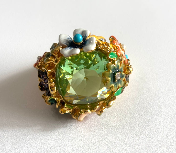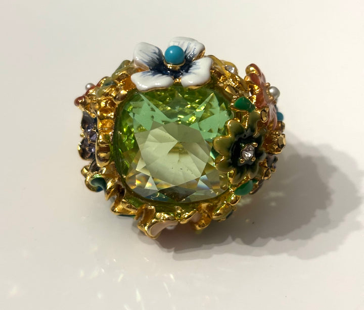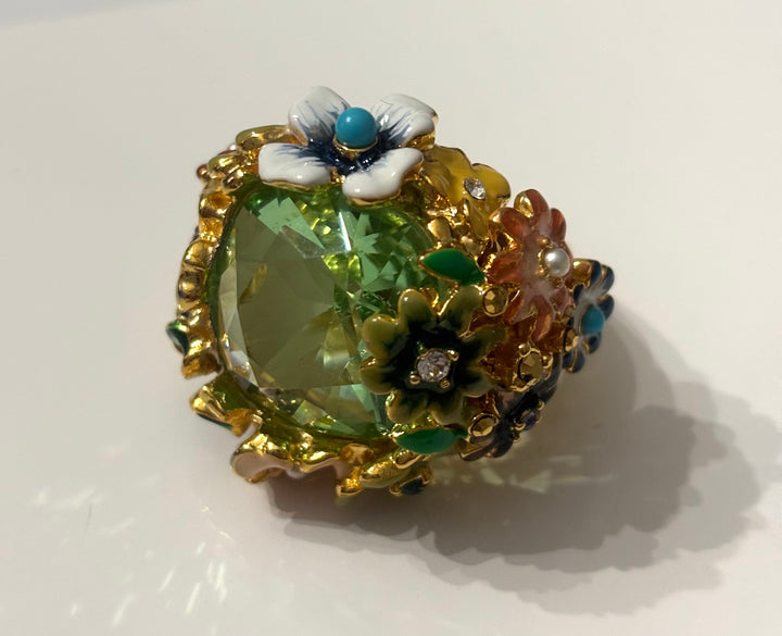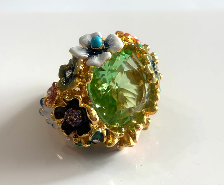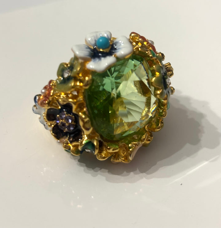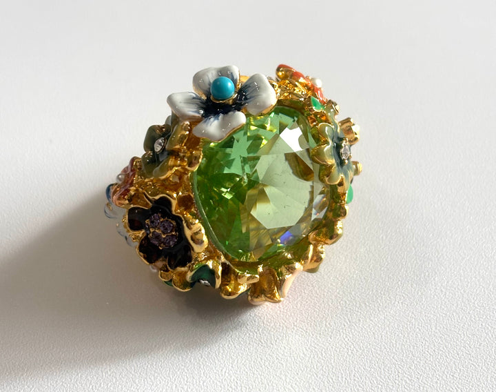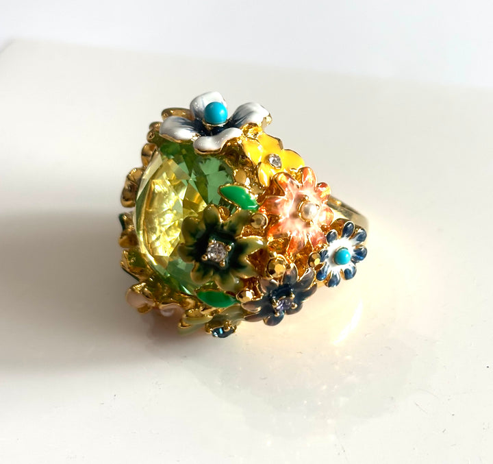 This fabulous "garden party" cocktail ring just became yours! Plated in 22-karat gold plating and finished with beautiful enamel flowers, the ring is complete with a glass peridot green center stone.