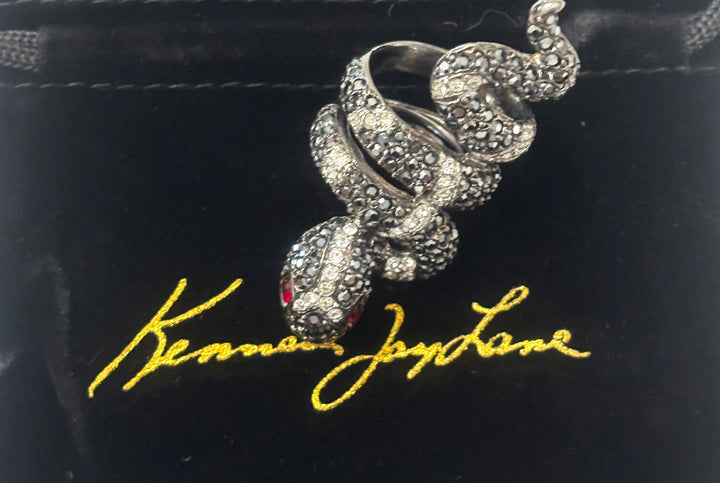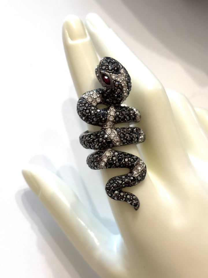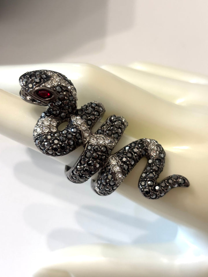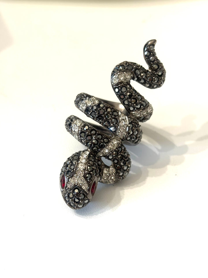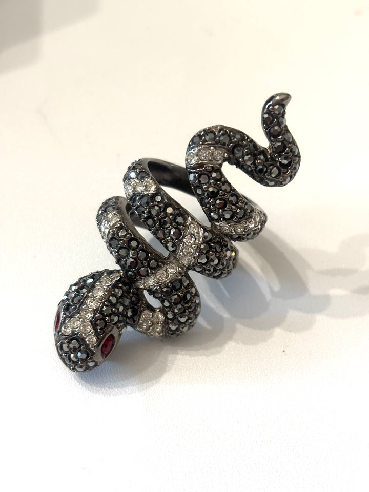 Product Description: Channel your inner serpentine with this dramatic gunmetal featuring hematite and crystal pavé snake ring.