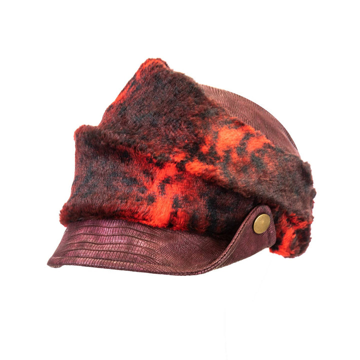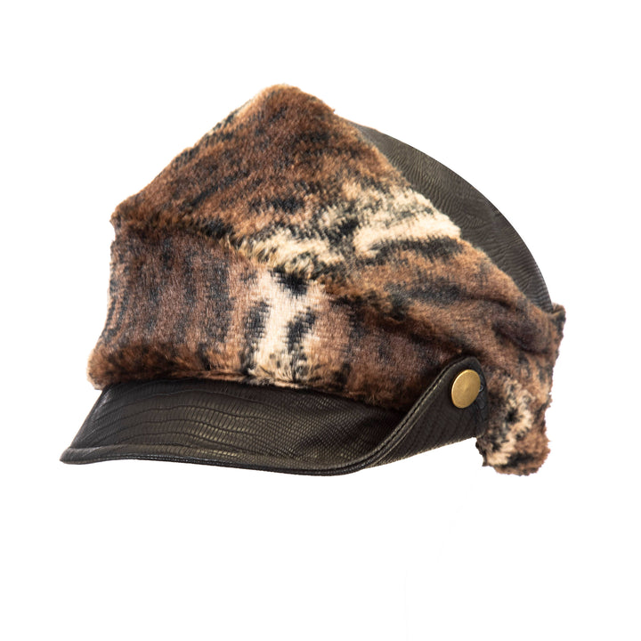 Giovannio X Cha Cha's House faux fur leopard cap with vegan leather, vegan leather features embossed lizard print and an antique button on the side. Adjustable sweatband for comfortable fit.