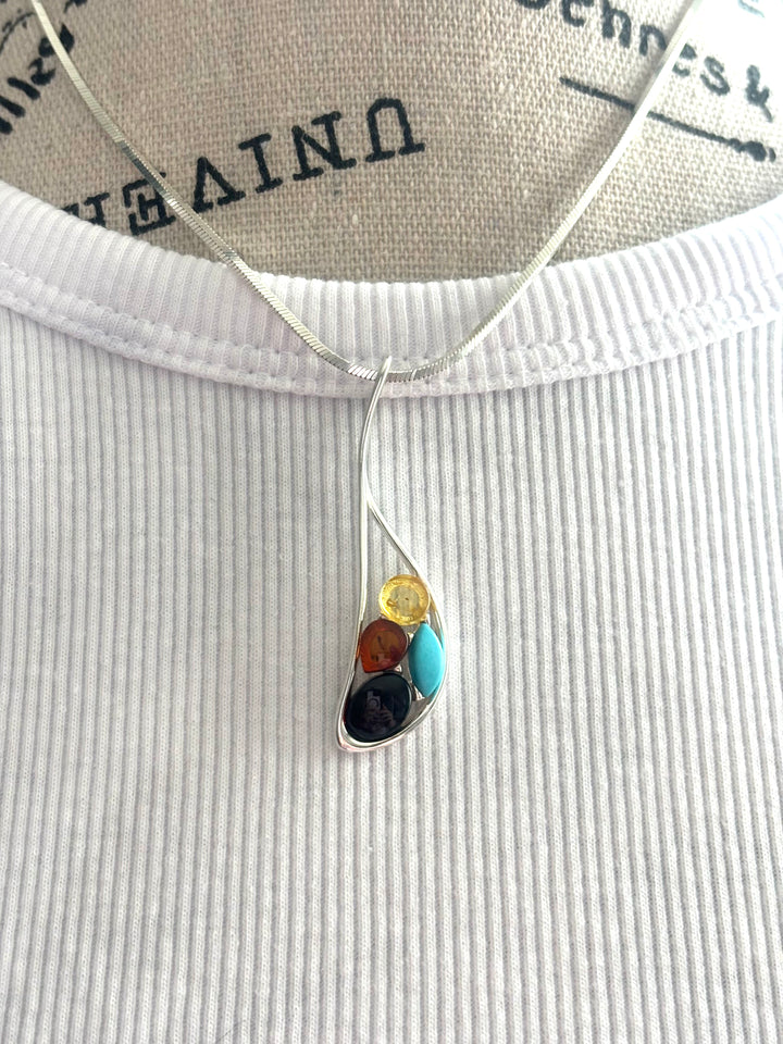 Featuring multi colored amber in sizes of 6mm, 6.5mm x 5.5mm, and 8.8mm x 6.5mm, and a vibrant turquoise gemstone measuring 9mm x 4mm, this pendant is a true statement piece. With a total pendant size of 47.7mm x 13mm, it's sure to catch attention and complete any outfit.