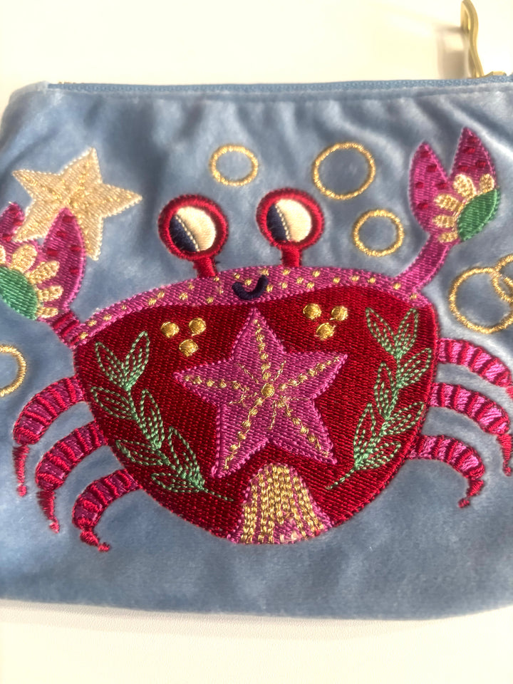 Dive into vibrant colours and playful embroidery! Our detailed seafaring crab dances around this luxurious velvet embroidered mini pouch, sure to brighten your everyday. Perfect for novelty gifting or adding a splash of luxury to your everyday!