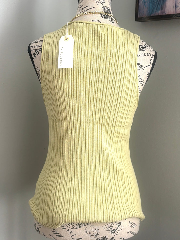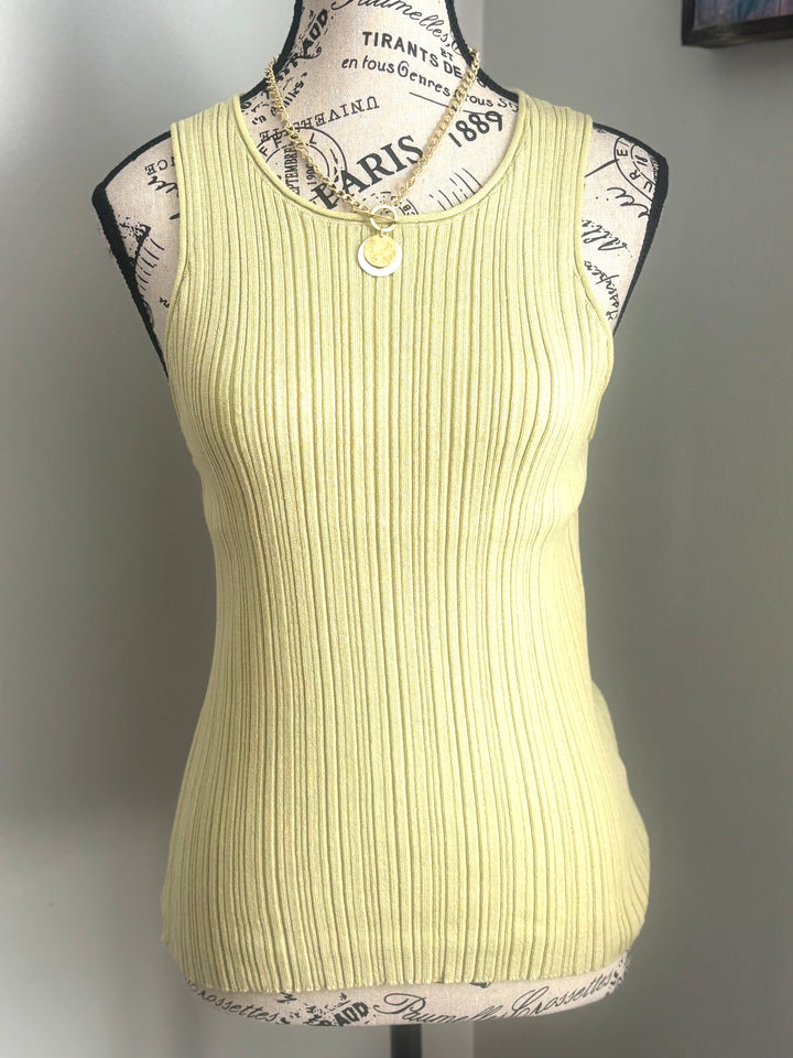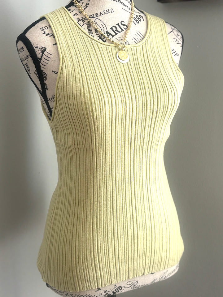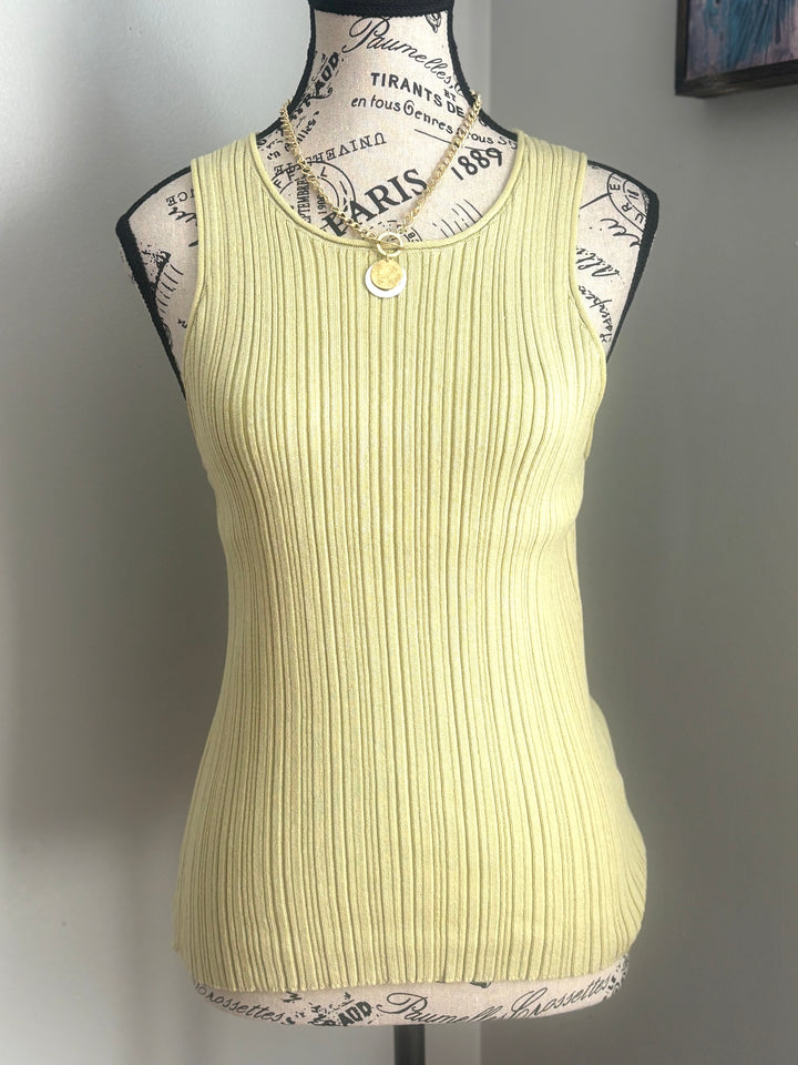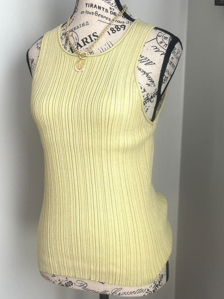 Knit Cotton Viscose Polyester Sweater Ribbed Round Neck Sleeveless Top. Medium featured on mannequin. True to size